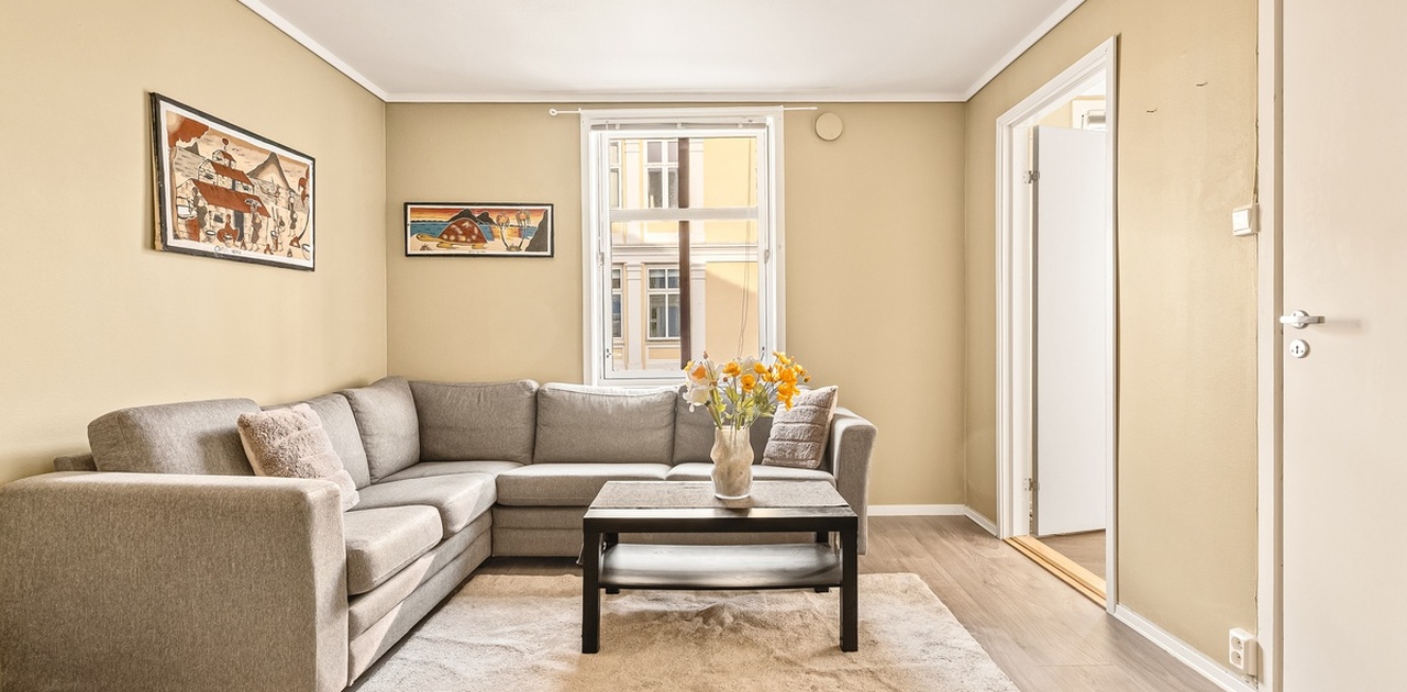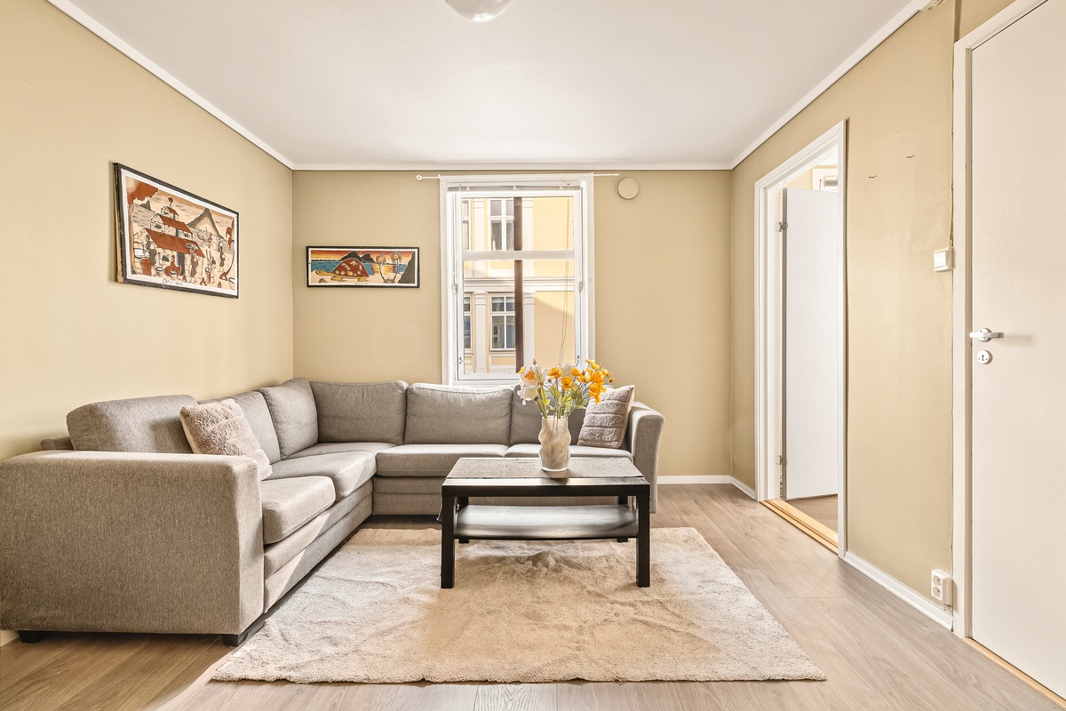 Leiligheten leies ut møblert med sofa, sofabord, teppe, veggkunst, spisebord med stoler og 120 cm seng (overmadrass medfølger ikke).