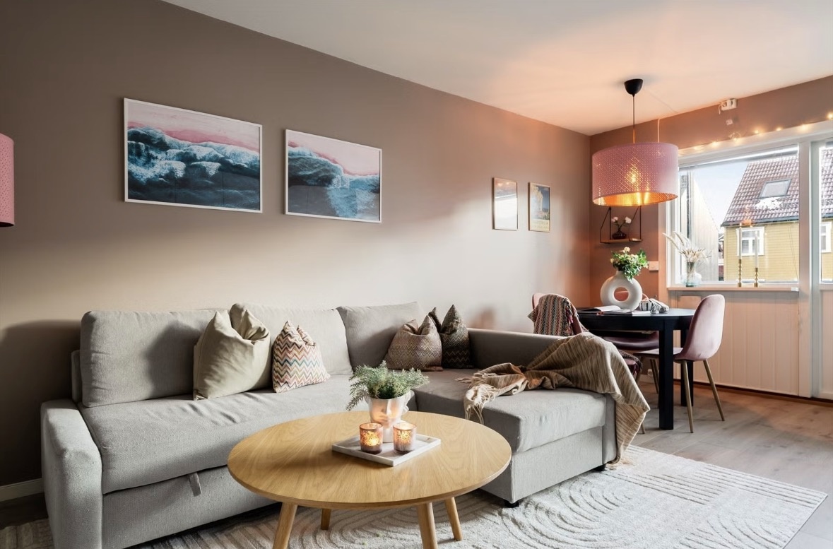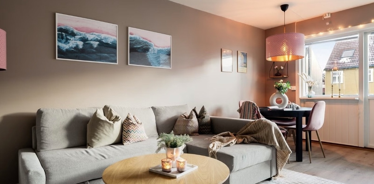 Leilighetens fellesareal er fullt møblert, mens soverommene er møblert med garderobeskap.
