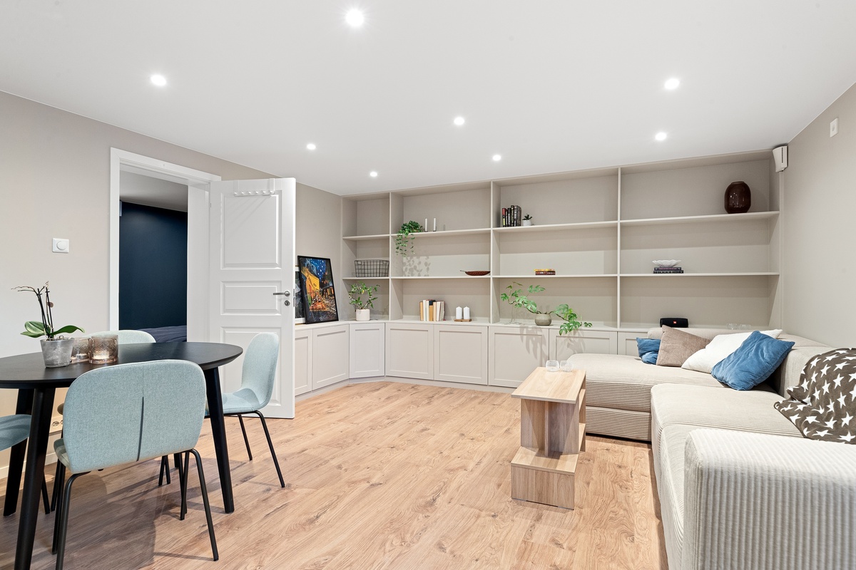 Leiligheten har store, lyse soverom med god skapplass, og et fint IKEA-kjøkken med alt av hvitevarer. De store vinduene slipper inn masse lys, og varmekablene i gulvene gir en deilig varme. Det er en felles inngang og trapp som gir en koselig atmosfære.