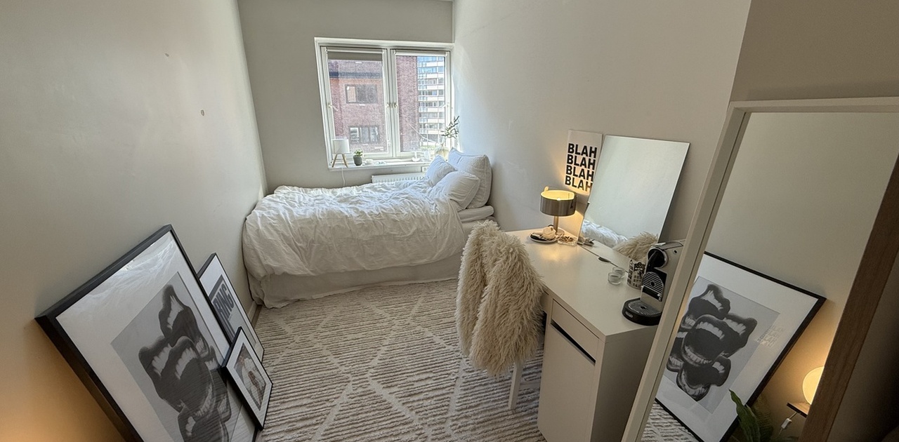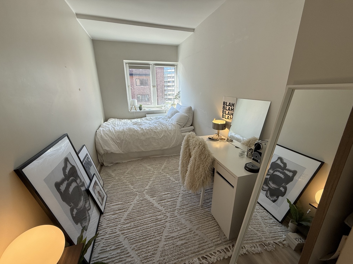 Jeg flytter ut av mitt rom 01.07. Rommet er mellom 10-11 kvadrat meter, veggen ved pulten (se bilde) gjør det litt vanskelig å si akkurat. Det er totalt 5 soverom i kollektivet, med felles kjøkken og bad. Nå bor det 4 andre jenter der, alle i starten av 20-årene. Leiligheten er veldig sentral, kun 3 minutters gange til Carl Berner. Også gå avstand til Grunerløkka. Buss/ trikk finner du rett utenfor døren. Sats, fresh og flere matbutikker ligger også rett ved. Rommet er allerede halvveis møblert; seng, klesskap, pult og stol følger med. På kjøkkenet er det masse skap plass og to kjøleskap med fryser. Overtakelse 01.07.2026, men dersom det er ønskelig er det mulig å flytte inn i starten av juni, for halv månedsleie, da jeg flytter ut første helgen i juni.