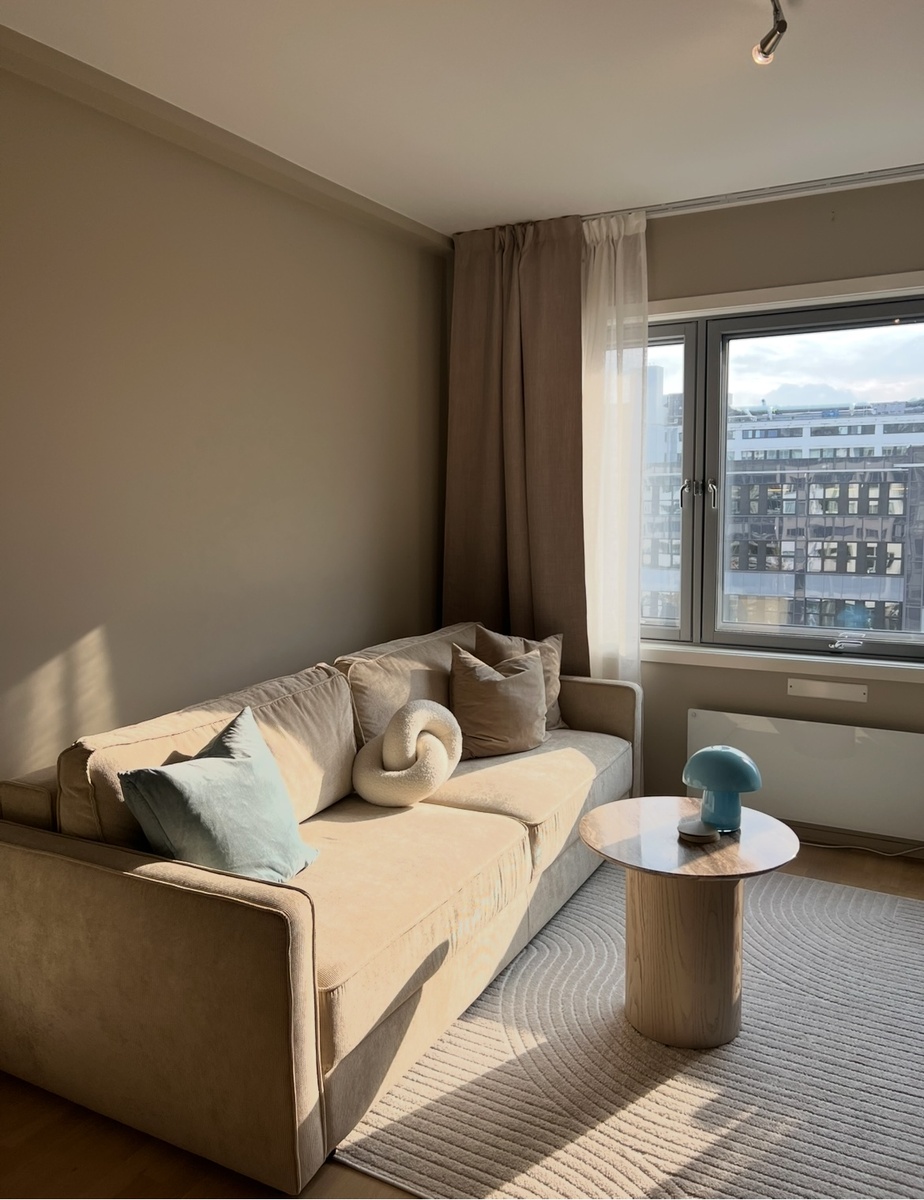Leiligheten er fullt møblert, med alt du trenger for å ha en flott sommer i Oslo. Leiligheten ligger i 6. etg med heis. Det er balkong med grill som kan benyttes gjennom flotte sommerkvelder. Soverommet har 150-seng, skap og skrivebord. Flott nyoppusset kjøkken, oppvaskmaskin, kaffemaskin og vannkoker. Det er også både vaskemaskin og tørketrommel. Kjøkkenet er fullt