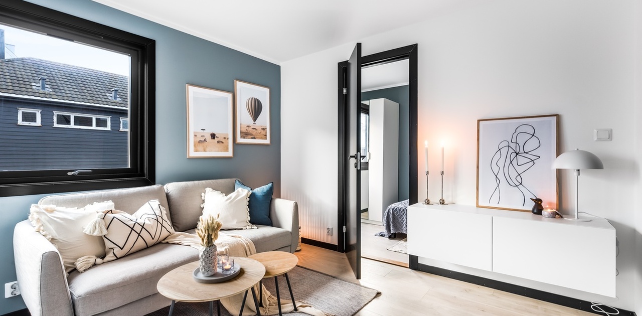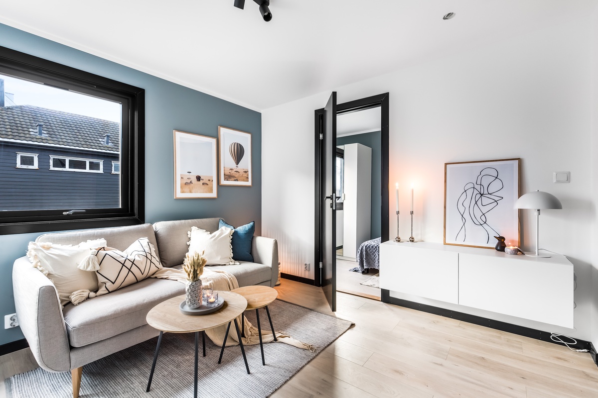 Ny 1-stavs laminat på gulv, og slette vegger malt i moderne fargenyanser.