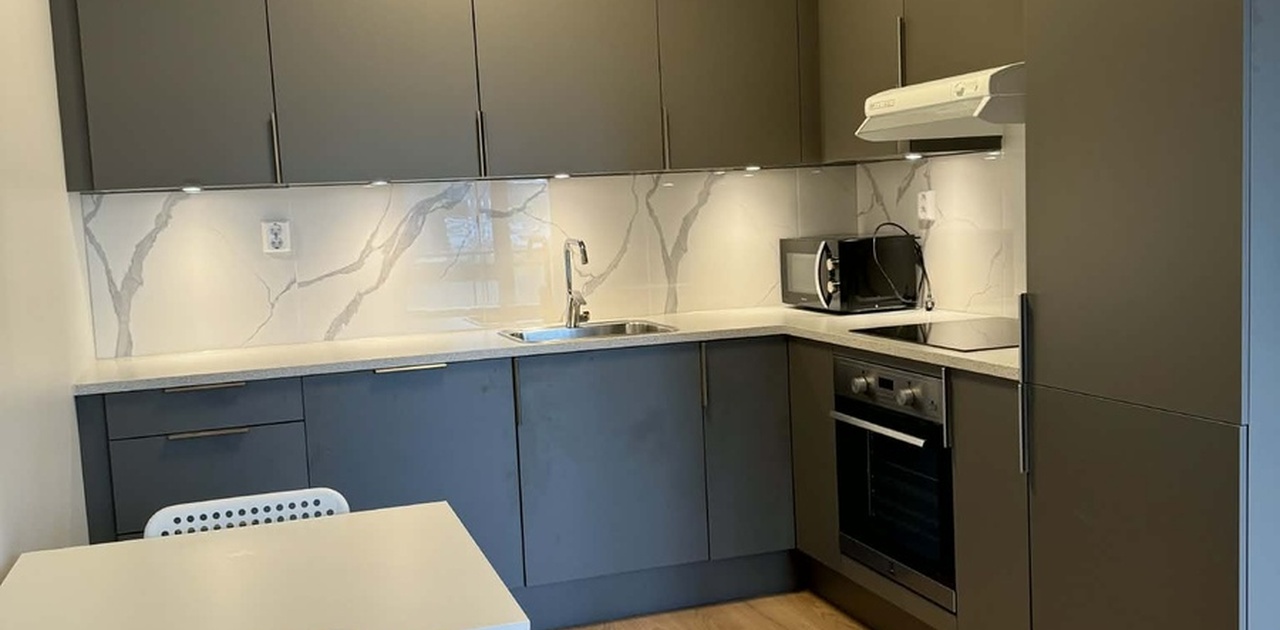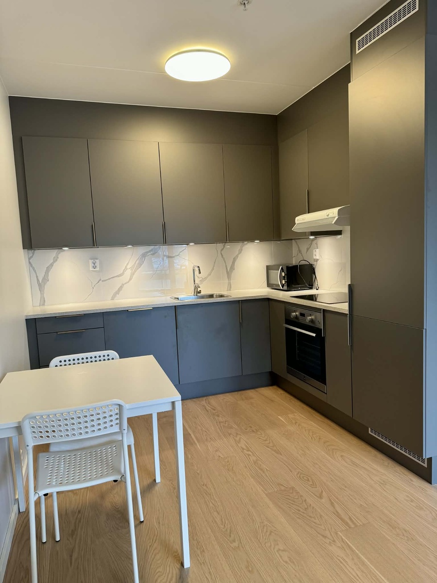ENSJØ – Moderne møblert 2-roms leilighet fra 2022 i 3. etasje med balkong. Minimalt bebodd. Helt nytt kjøkken.