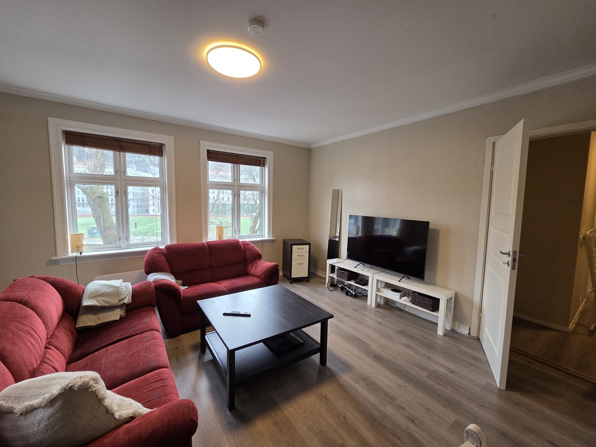 Vi bor i en leilighet på 75 kvm i første etasje, med tre soverom, ett bad, kjøkken, gang og stor stue. Soverommene er omtremt like store og ca 8 kvm. Leiligheten ligger rett ved bybanen med reisevei på 10 minutter til sentrum.