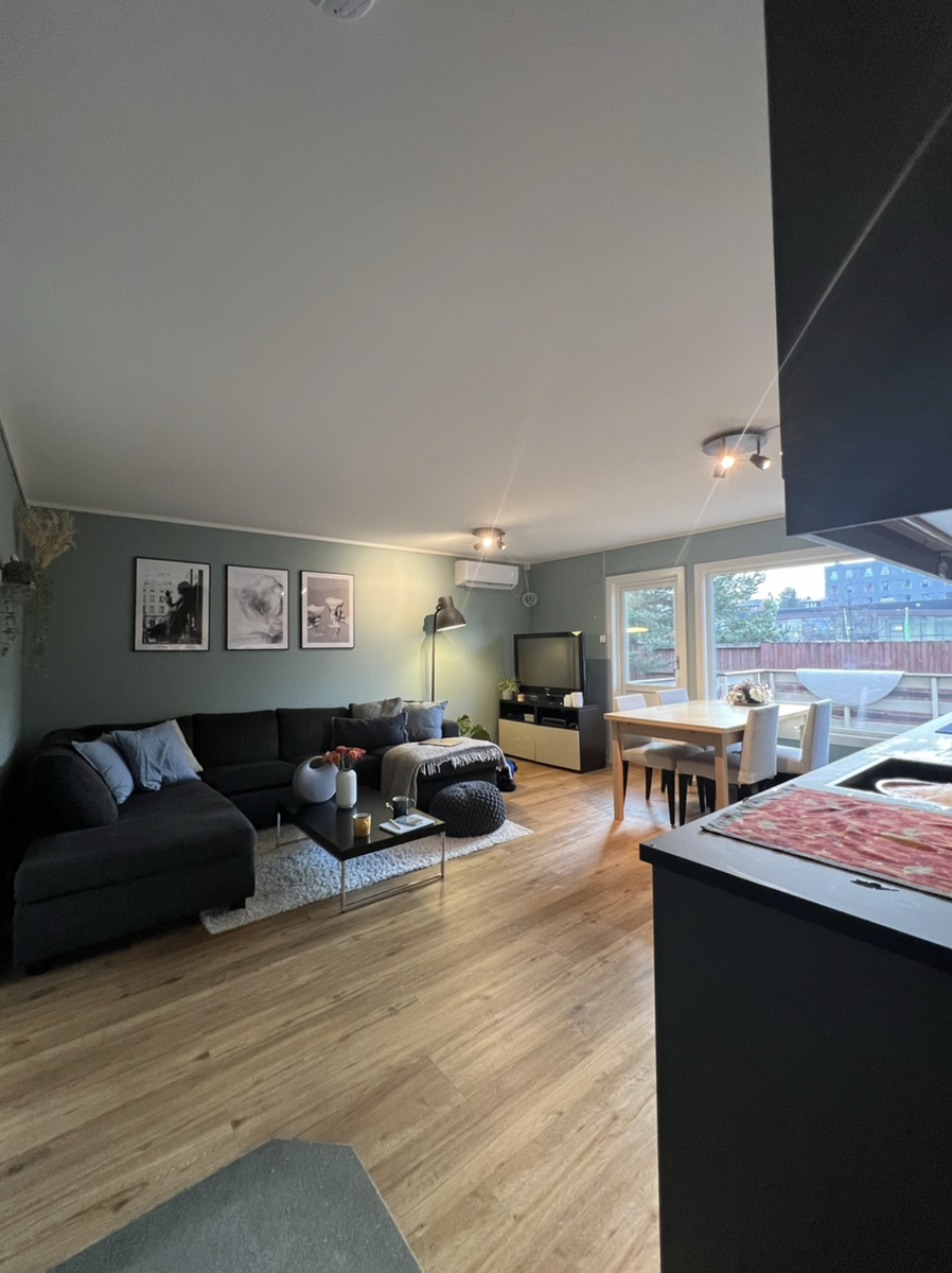 Leiligheten var nyoppusset i 2021 og har derfor høy standard på kjøkken, bad, vinduer osv. Fasiliteter inkluderer en varmepumpe, en stor og en liten fryseboks, og en kombinert vaskemaskin og tørketrommel. Det er en stor stue/kjøkken med gode muligheter for å ha besøk og hyggelige kvelder. I tillegg har leiligheten en stor terrasse med mye sol om sommeren og en bod i kjelleren (ca. 15kvm) med mulighet for oppbevaring. Det tilhører også en parkeringsplass til leiligheten.