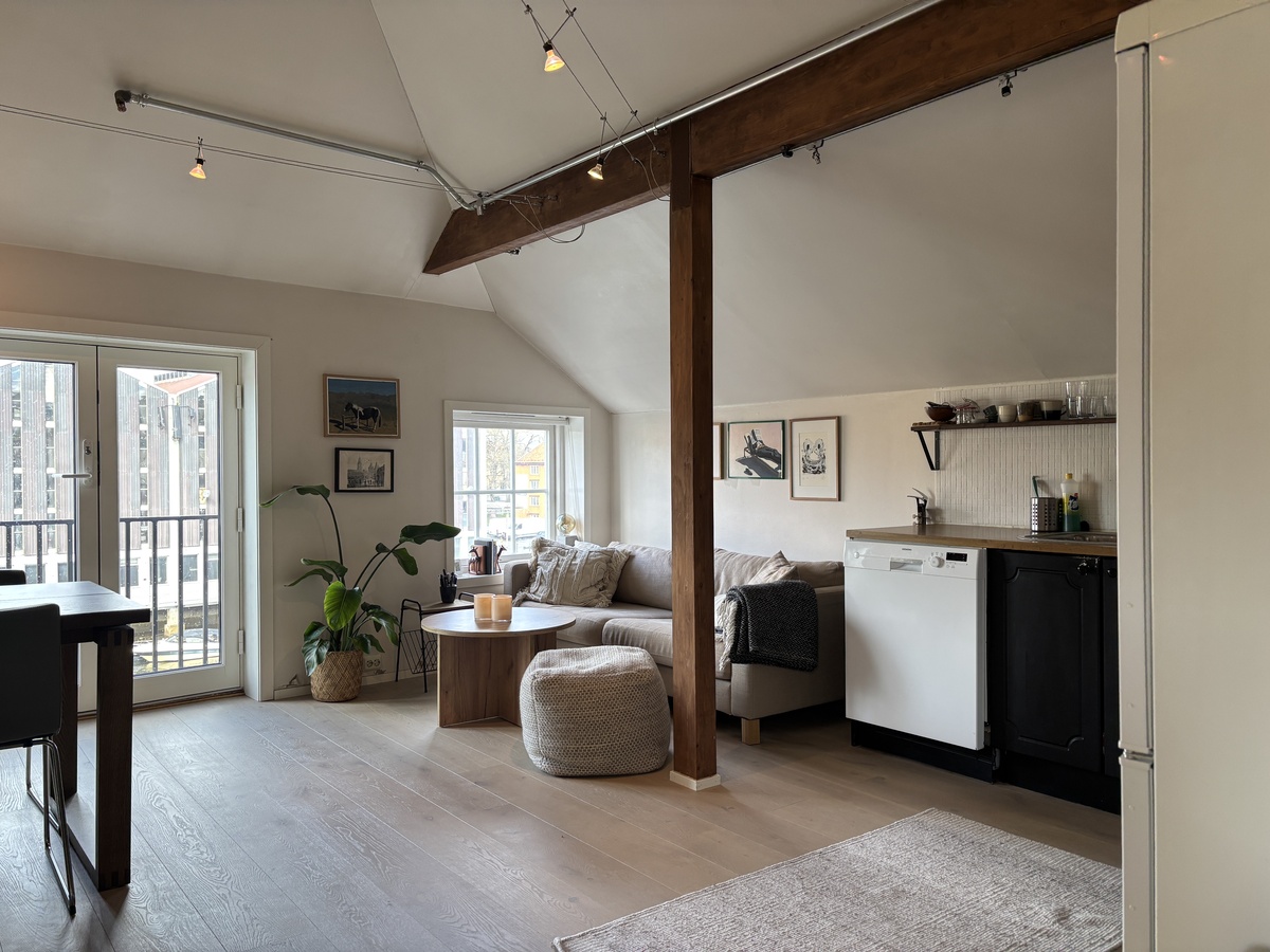 Leilighet til leie i Nygata 22B, med smart planløsning og sentral beliggenhet. Leiligheten har ett soverom, oppusset bad og en praktisk hems som kan brukes til ekstra soveplass eller oppbevaring.