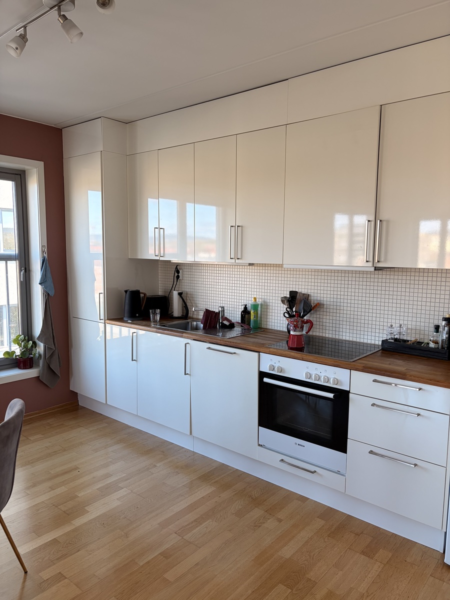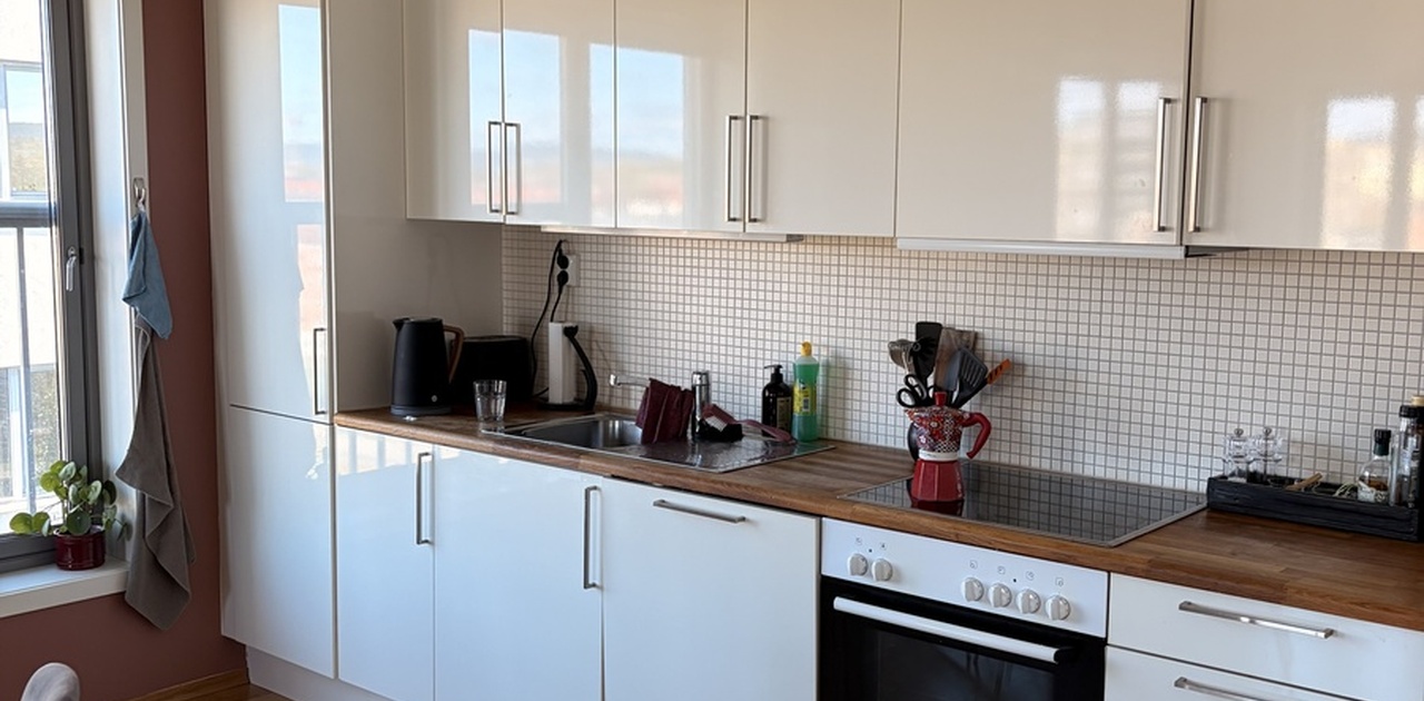 Leiligheten er lys, koselig og ligger i 8. etasje, med kort gåavstand til T-bane (ca. 3–4 minutter).