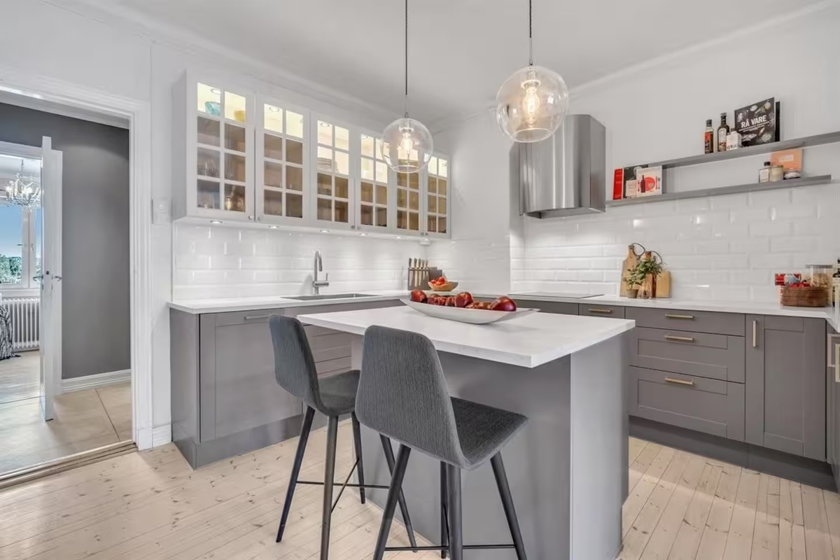Leiligheten har et romslig og praktisk kjøkken med integrerte hvitevarer og vinskap. Stuen er stor og luftig, med god plass til både sittegruppe og spisebord. TV er også i stua, selv om den ikke er avbildet.