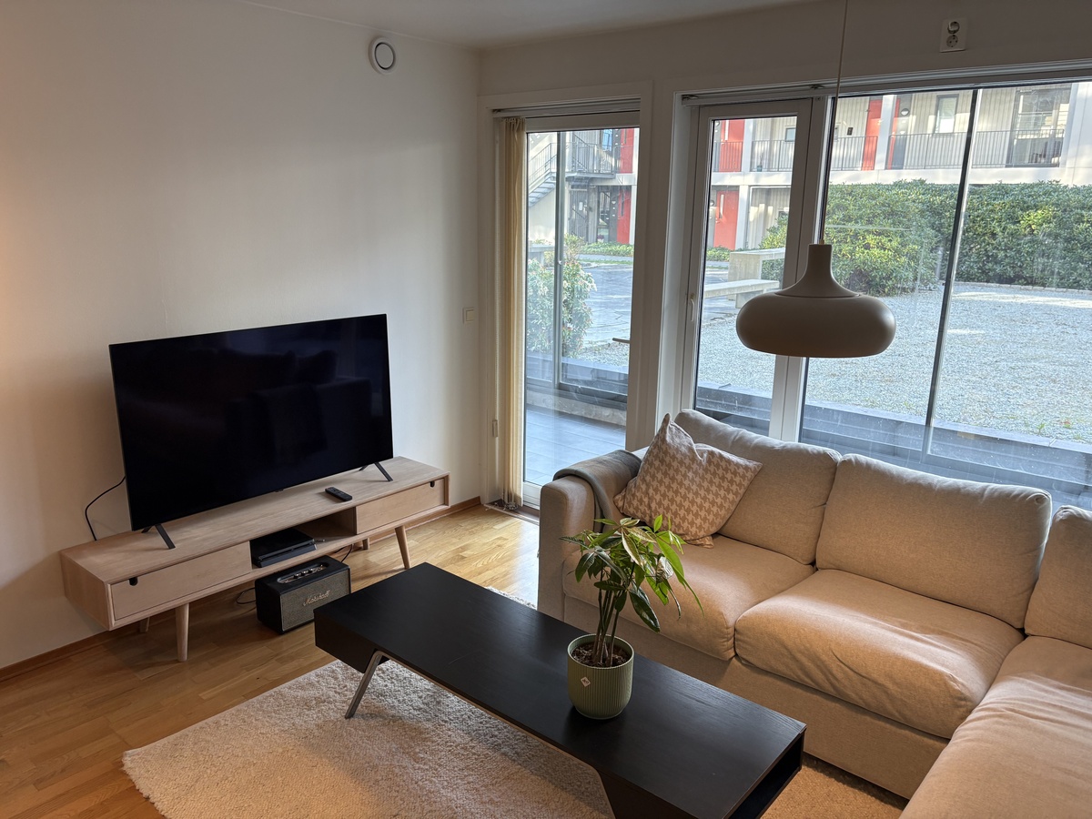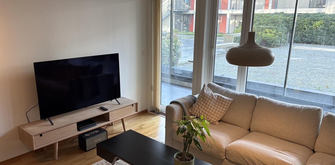 Leiligheten er 2 minutter unna busstopp og daglivarebutikk.