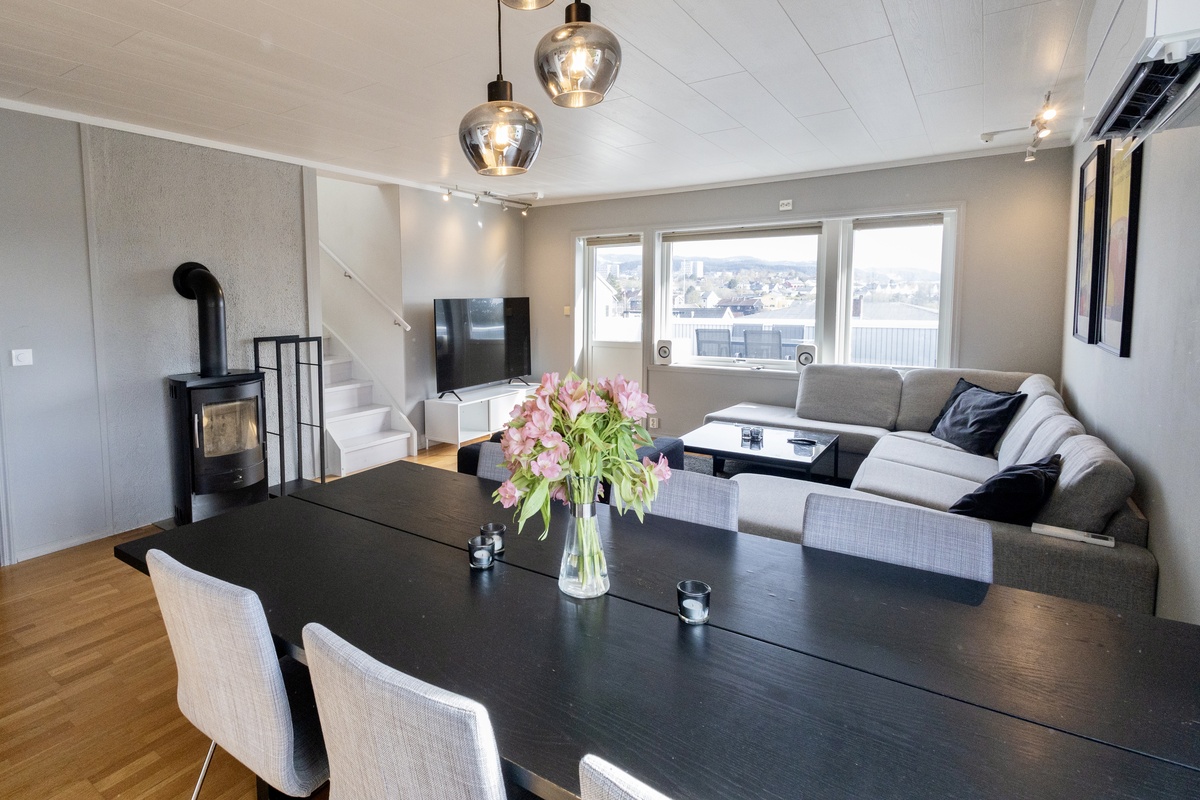 Bolig med 5 soverom, stue, kjøkken, bad og en takterrasse på ca. 25 kvm. Takterrassen er møblert med spiseplass, utesofa og grill, alt inkludert.