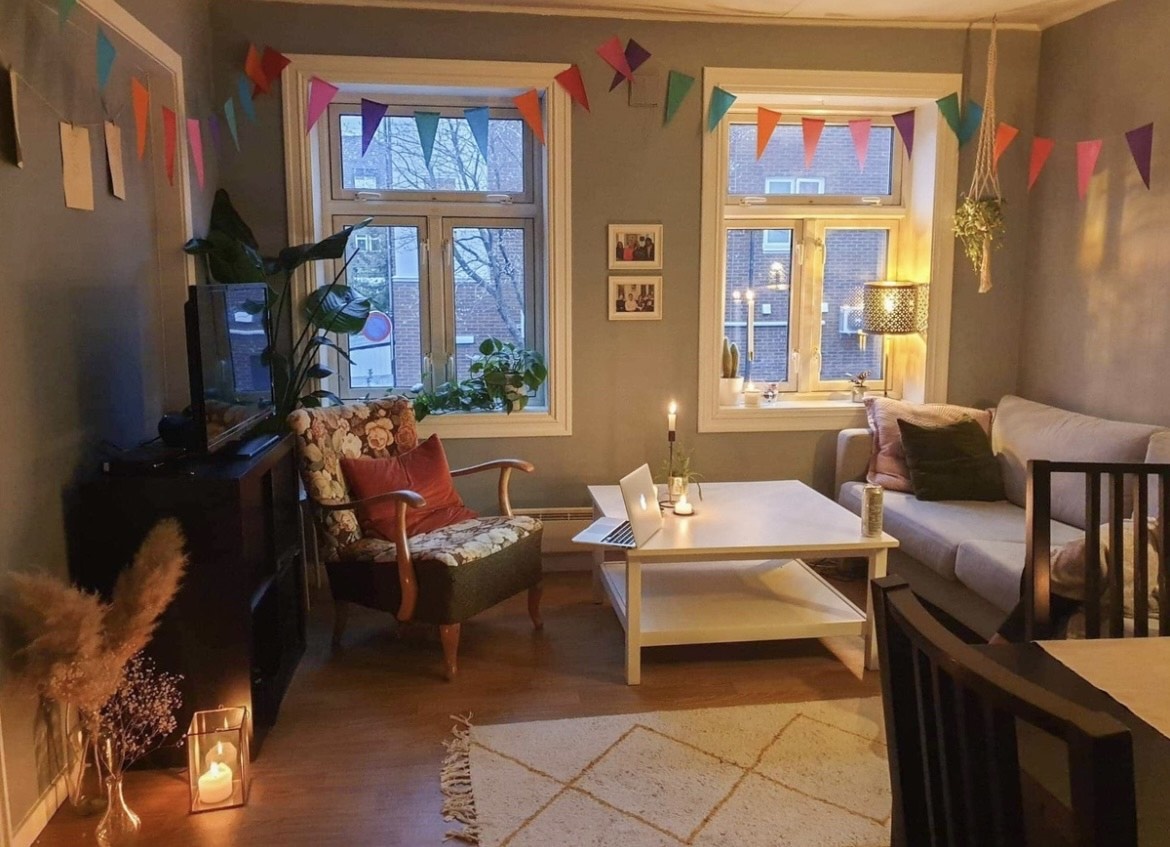 Leiligheten er hjemmekoselig og har felles stue, kjøkken og bad. Den er møblert i fellesarealene av oss som bor her.