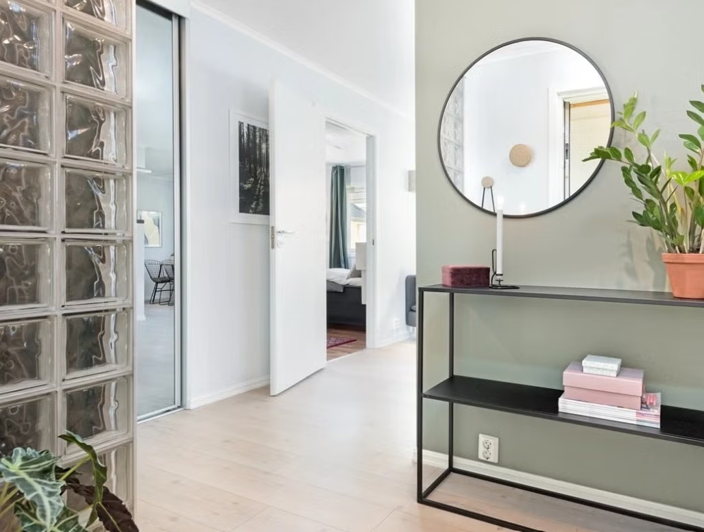 - Entre med stor speilgarderobe for oppbevaring av sko, klær og annet utstyr.
