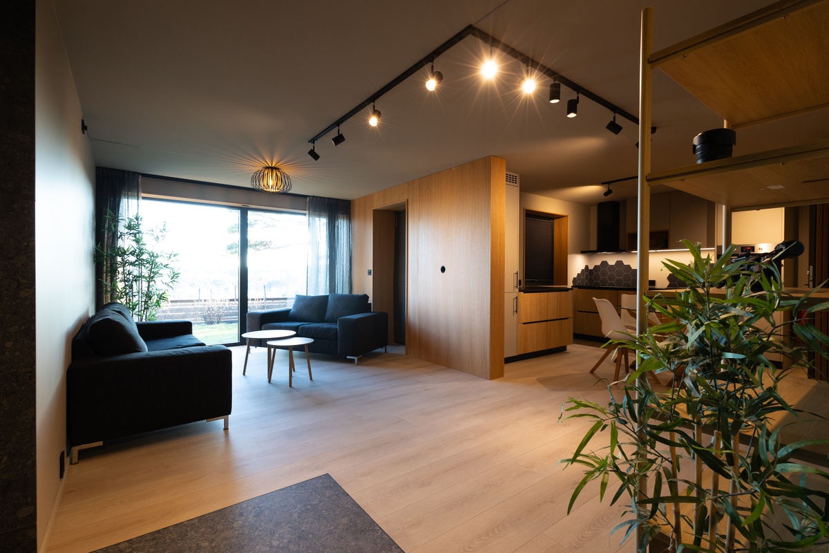 Lys stue med åpen kjøkkenløsning.