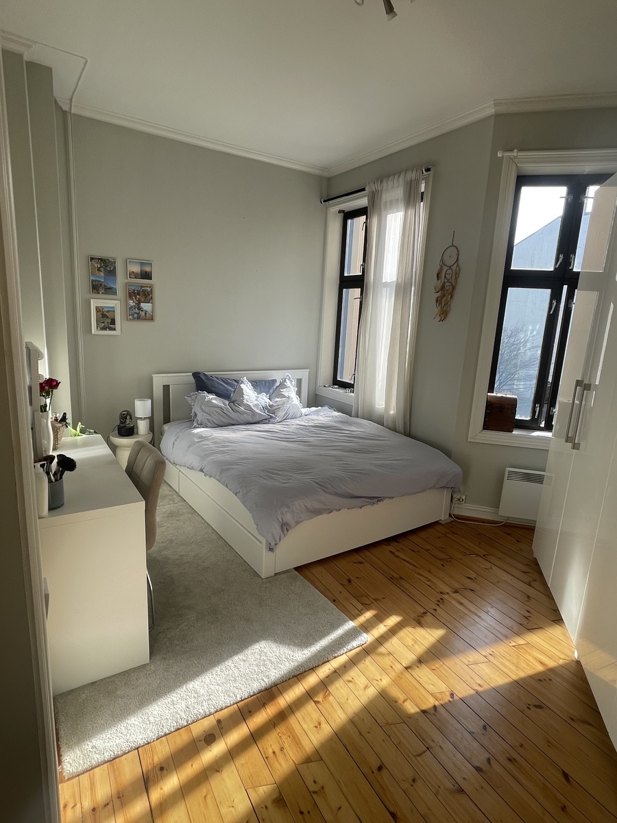 Rommet som leies ut er vendt inn mot bakgården. Det har store vinduer som slipper inn mye naturlig lys. Rommet er på ca 15 kvm, mulig litt størret. Det har to store garderobeskap som også følger med + et innebygd skap ved siden av. Vi har også loft i toppen av bygget dersom du trenger ekstra lagringsplass.