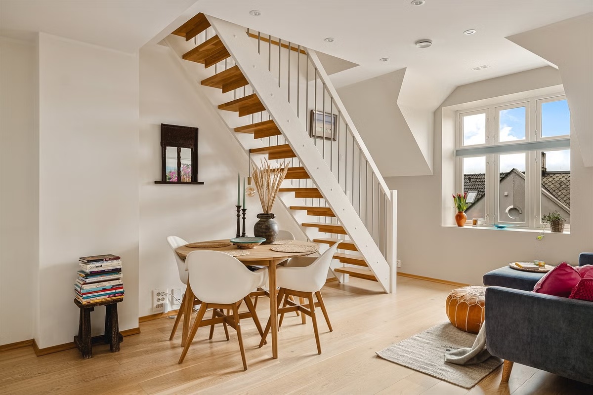 Leiligheten går over to etasjer, hvor andre etasje består av mitt soverom. Den har åpen stue- og kjøkkenløsning med god plass, samt ett romslig bad. I tillegg er det en stor bod i kjelleren med gode oppbevaringsmuligheter.
