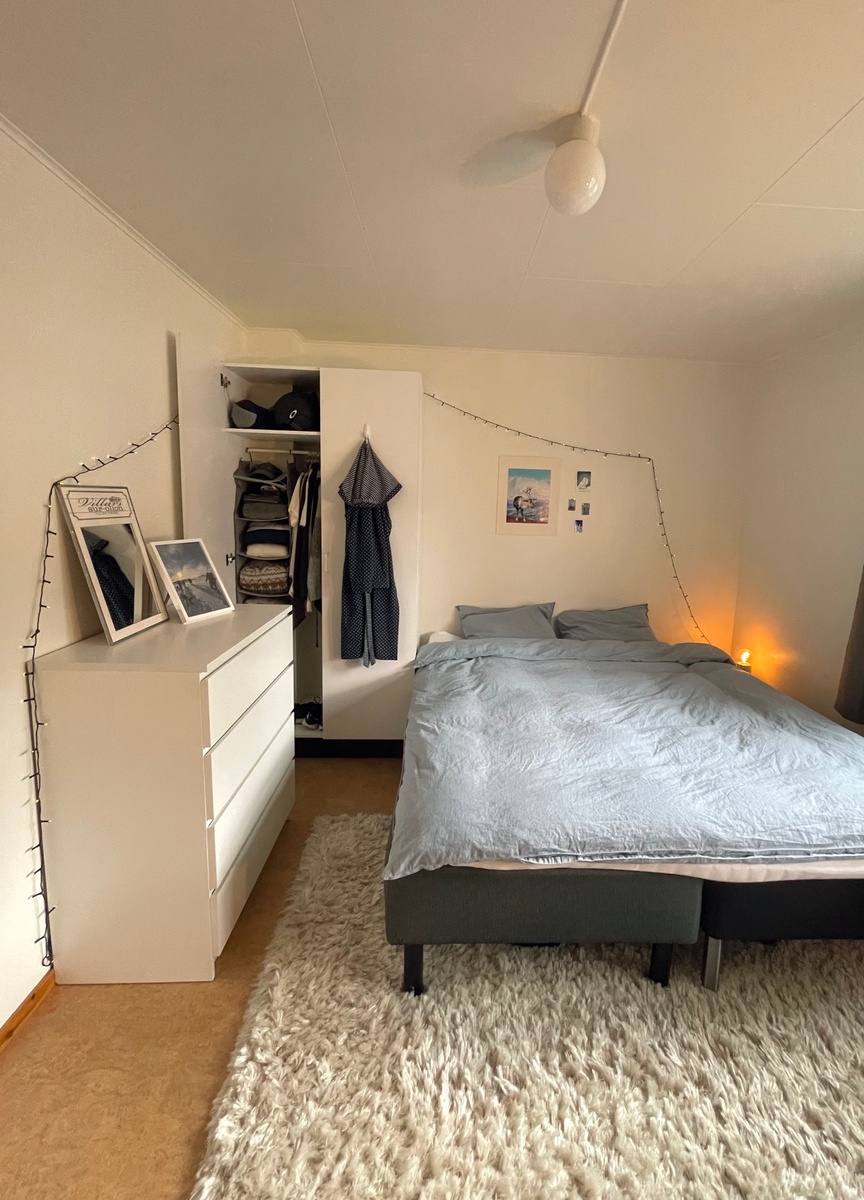 Rommet leies ut møblert med seng (to enkeltsenger satt sammen til dobbeltseng), skrivepult, skap, lystette gardiner og både kontorstol og lenestol. Før innflytting rydder jeg bort alle personlige eiendeler og sørger for at rommet er grundig vasket.