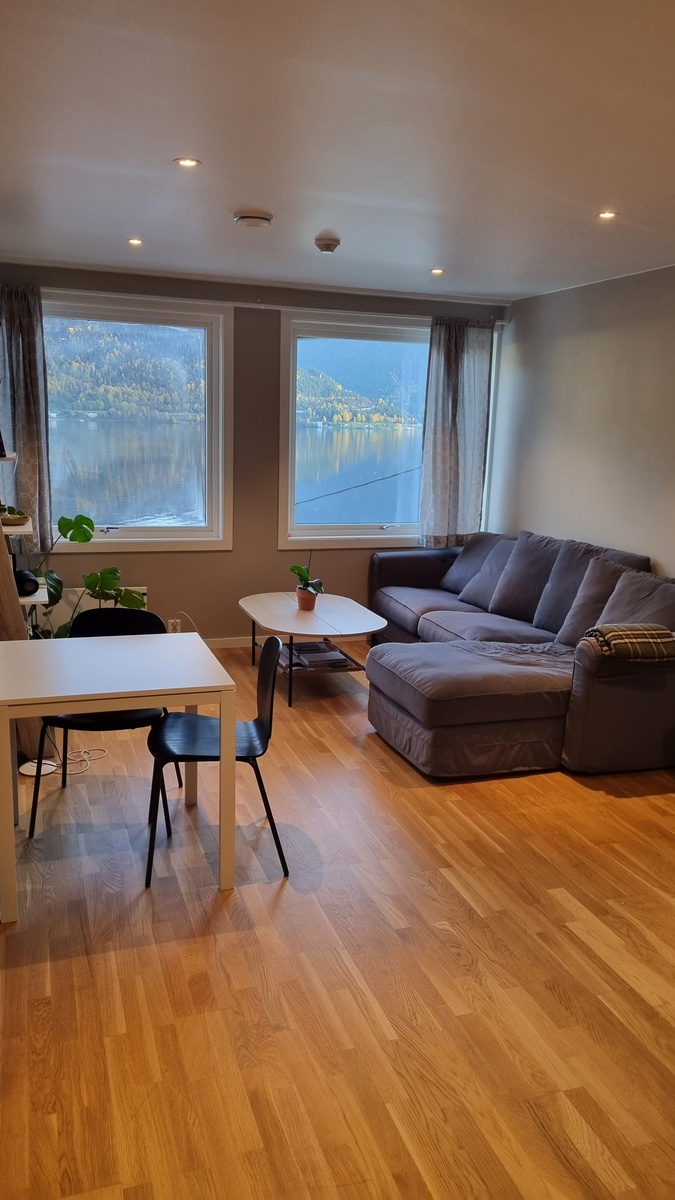 Leiligheten er praktisk med stue, kjøkken og soverom, samt et romslig bad og en stor innvendig bod. Den ligger vendt mot fjorden og har en utsikt over fjellet, fjorden og husene ved Fjordstien.
