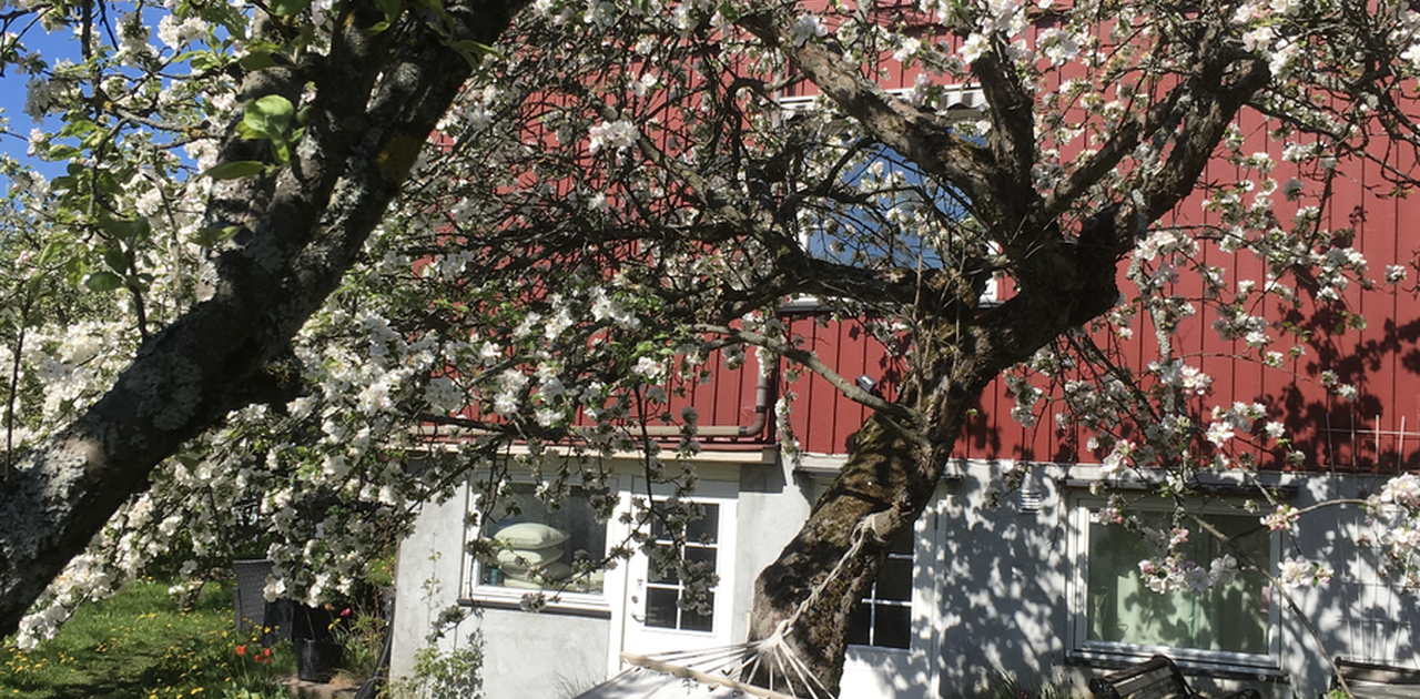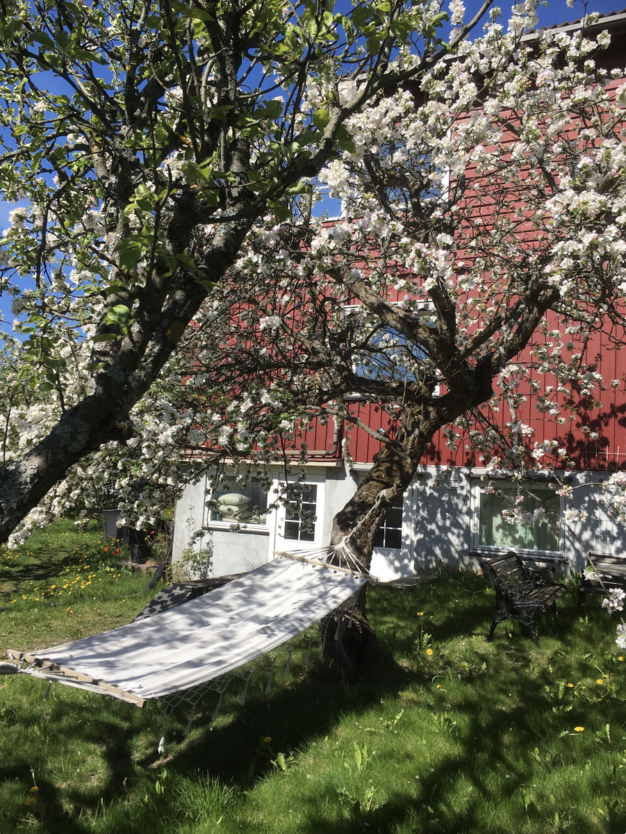 Hagen er stor og kjempefin, og frukost i hagen er veldig hyggelig.