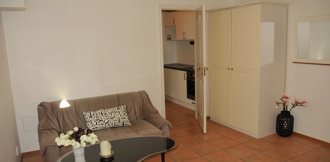 Kjøkkenet er plassert mellom stuen og soverommet.