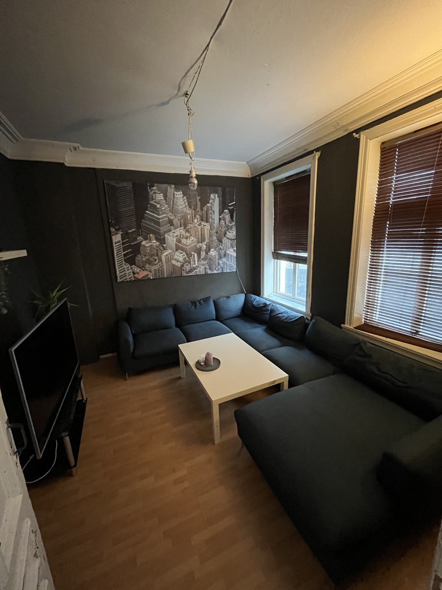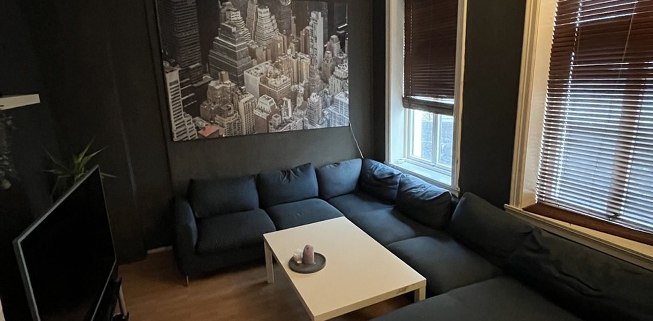 Seks-roms leilighet til leie fra 1. august for fem personer ( fem soverom) Ca. 100 kvm. Fellesstue. Oppvaskmaskin, vaskemaskin og tørketrommel. Kombiskap. Fellesstue, ca. 16 kvm. Møblert. Hvert rom har 1,2 m brei seng, bokhylle, garderobeskap, pult og stol. Kr. 34200 pluss strøm og evt. fiberkabel (internett). For visning send sms til 96208888; ikke ring. Personlig frammøte. Leiligheten ligger rolig til selv om det er midt i sentrum. Kort avstand til alle byens fasiliteter og studentaktiviteter. Bildene er ikke oppdaterte; f.eks. stova er hvit.