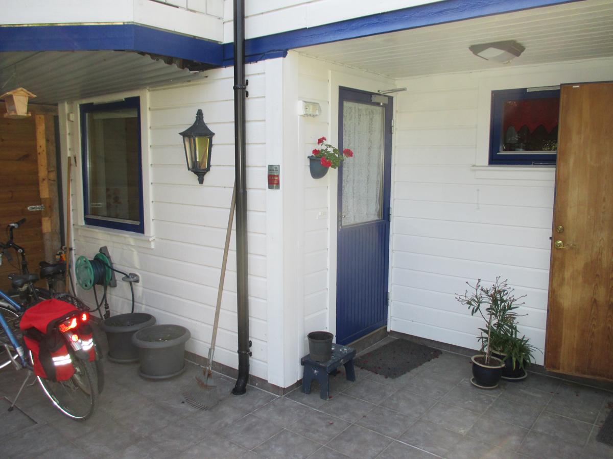 Hybelen har egen inngang og terrasse på baksiden med kveldssol.