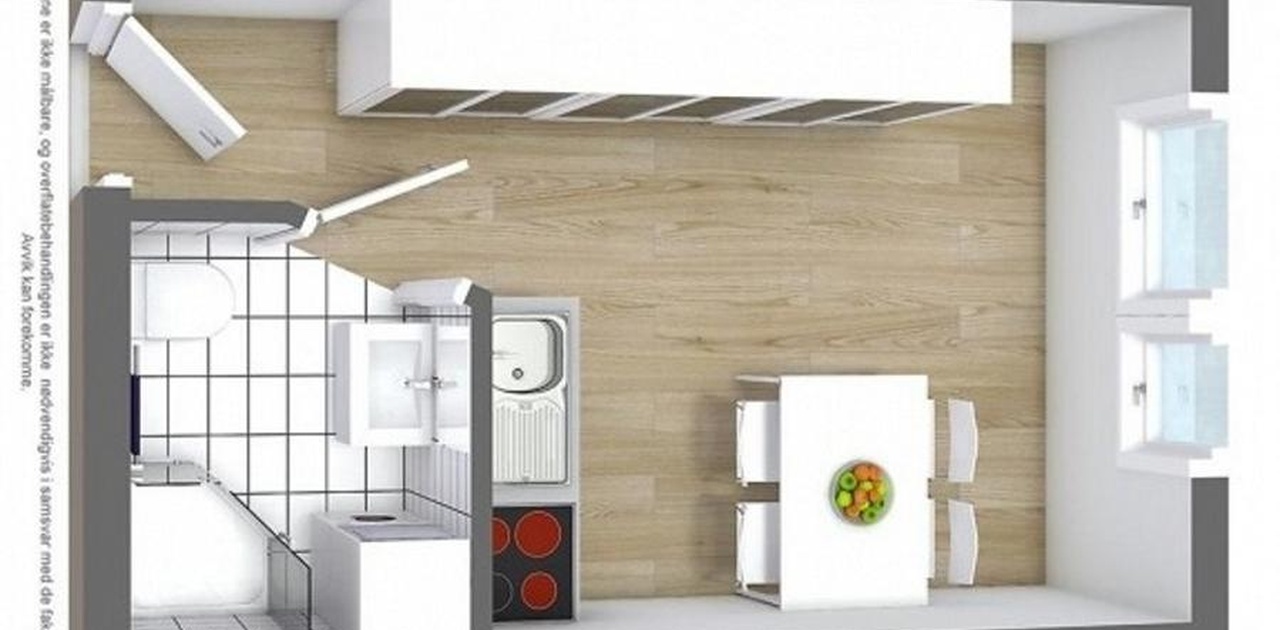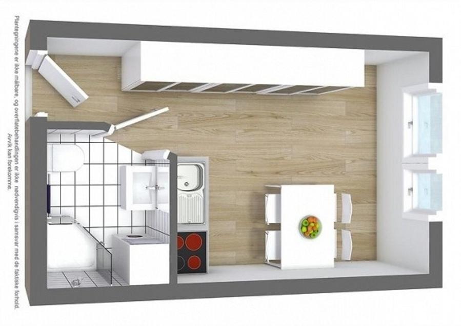 Inneholder: Entre, bad, åpen kjøkken/stueløsning. Leiligheten er ferdig innredet med smarte hylle/skap løsninger, samt plass til sovesofa. Det er fransk balkong ut fra stuen.