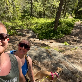 Vi har en liten/ medium hund, gatemix fra Mexico, på drøyt 13kg. Vi har hatt henne i overkant av 10 år. Hun er minimum 11 år gammel (fødselsdato er ukjent), husrein, lydig, og veldig folkekjær. Hun har heller ikke helt funnet ut hvordan bjeffing fungerer - noe vi synes er helt ålreit 😅 (vi tar henne gjerne med på en eventuell visning så dere kan treffe henne også).
