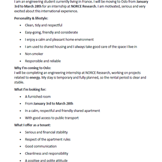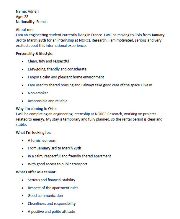 Hi, my name is Adrien, I’m 28 years old and I’m from France. I’m an engineering student and I will be moving to Oslo from January 3rd to March 28th for an internship at NORCE Research. I’m a clean, respectful and easy-going person, and I appreciate a calm and friendly home environment. I’m responsible, organized and used to living in shared apartments. I’m looking for a furnished room for the duration of my stay and I’m flexible and easy to communicate with.