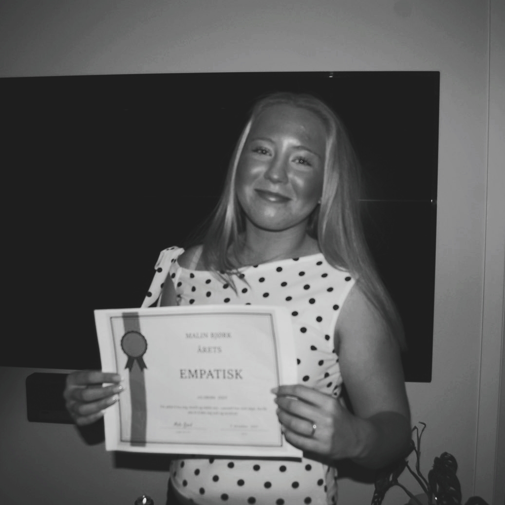 Mitt navn er Malin Bjørk. Jeg er fra Horten og er født 23.01.2010. Jeg er ei pliktoppfyllende jente, som liker å være aktiv både sosialt og fysisk. Jeg er veldig glad i ha ha det rent og ryddig, og trives godt med det. I et kollektiv er jeg den som bidrar til det sosiale, og fellesoppgaver for at alle skal kunne trives best mulig.