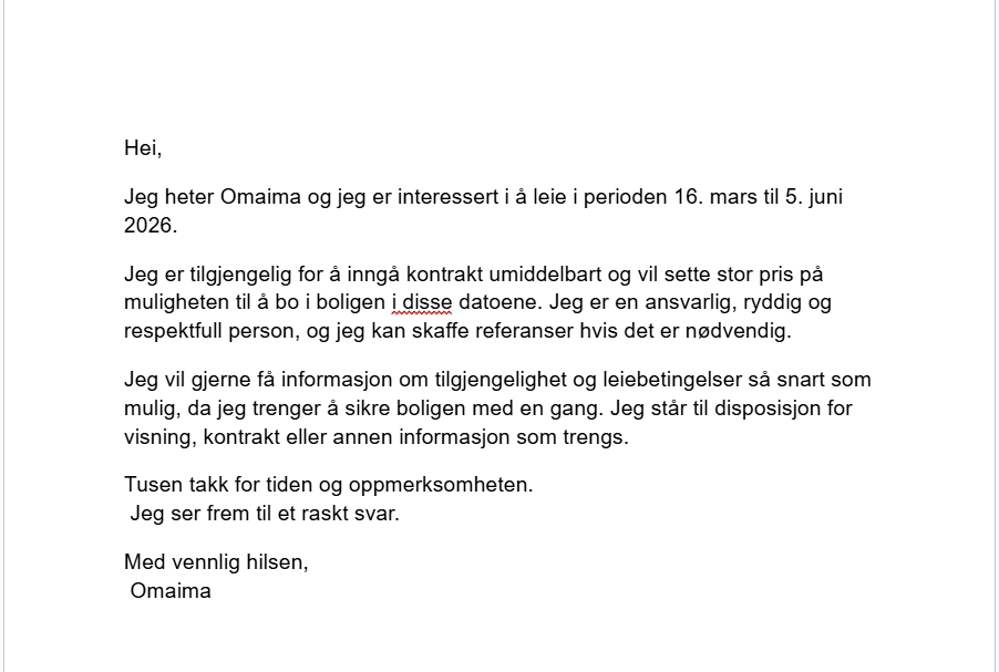 Jeg er tilgjengelig for å inngå kontrakt umiddelbart og vil sette stor pris på muligheten til å bo i boligen i disse datoene. Jeg er en ansvarlig, ryddig og respektfull person, og jeg kan skaffe referanser hvis det er nødvendig.