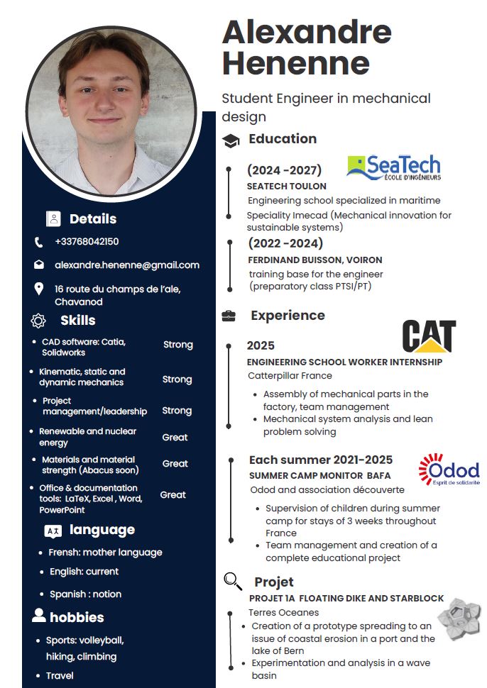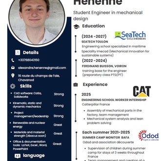 - Utdannelse Andreårs ingeniørskole, med spesialisering i mekanisk innovasjon for bærekraftige systemer