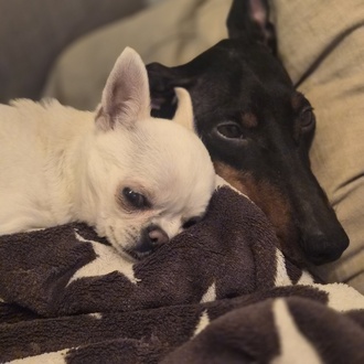 En Manchester Terjer som er litt mere liv. Synes fremmede er litt skummelt. Men får hun tid, så er det ikke skummelt lenger.